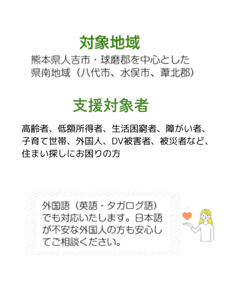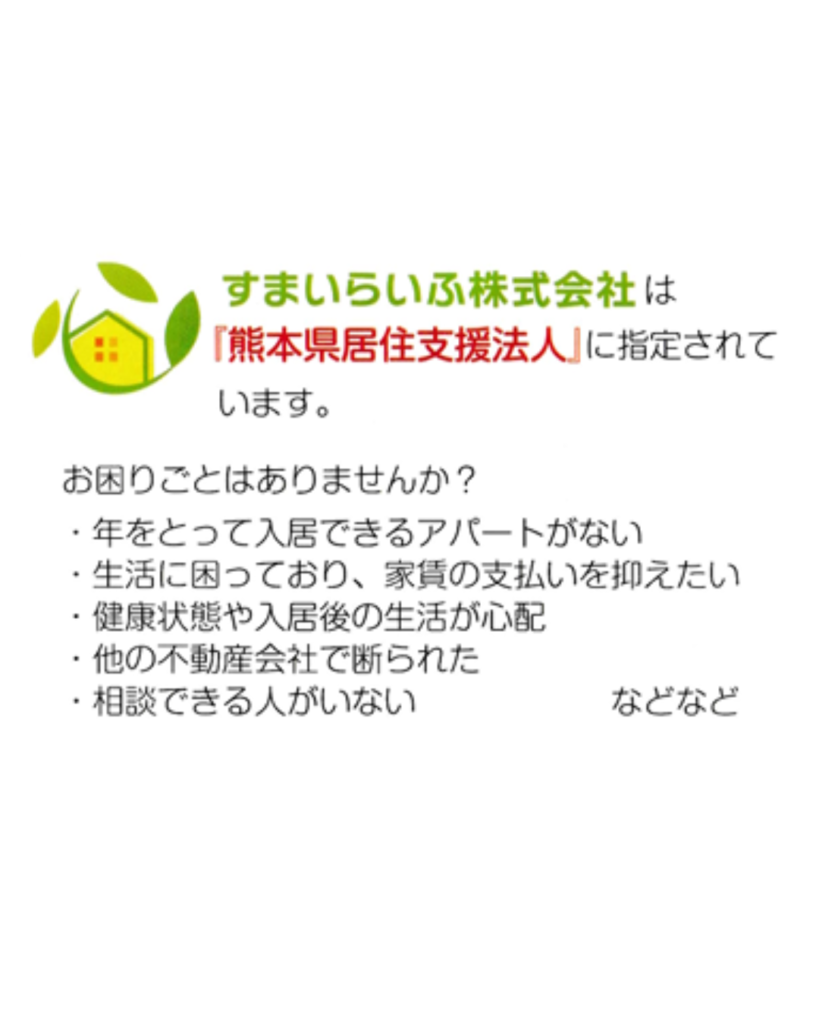 居住支援法人 居住支援 2026/4/23 「すまいらいふ株式会社」は熊本県の居住支援法人に指定されています🏠 熊本県人吉市・球磨郡を中心とした県南地域(八代市、水俣市、葦北郡を含む)を対象に、高齢者、低額所得者、子育て世帯、障がい者、外国人、被災者、DV被害者の方など、住まい探しにお困りの方のご相談に応じ、必要な情報提供や物件探し、入居後の支援などを行なっております。 ご相談は無料です。お気軽にご相談ください🍀 熊本県人吉市合ノ原町1811-4Tel 0966-27-4798